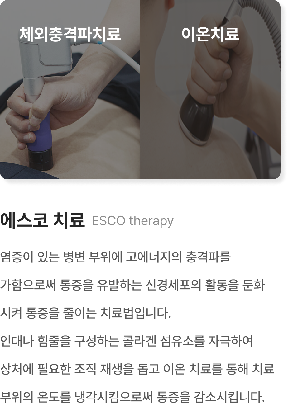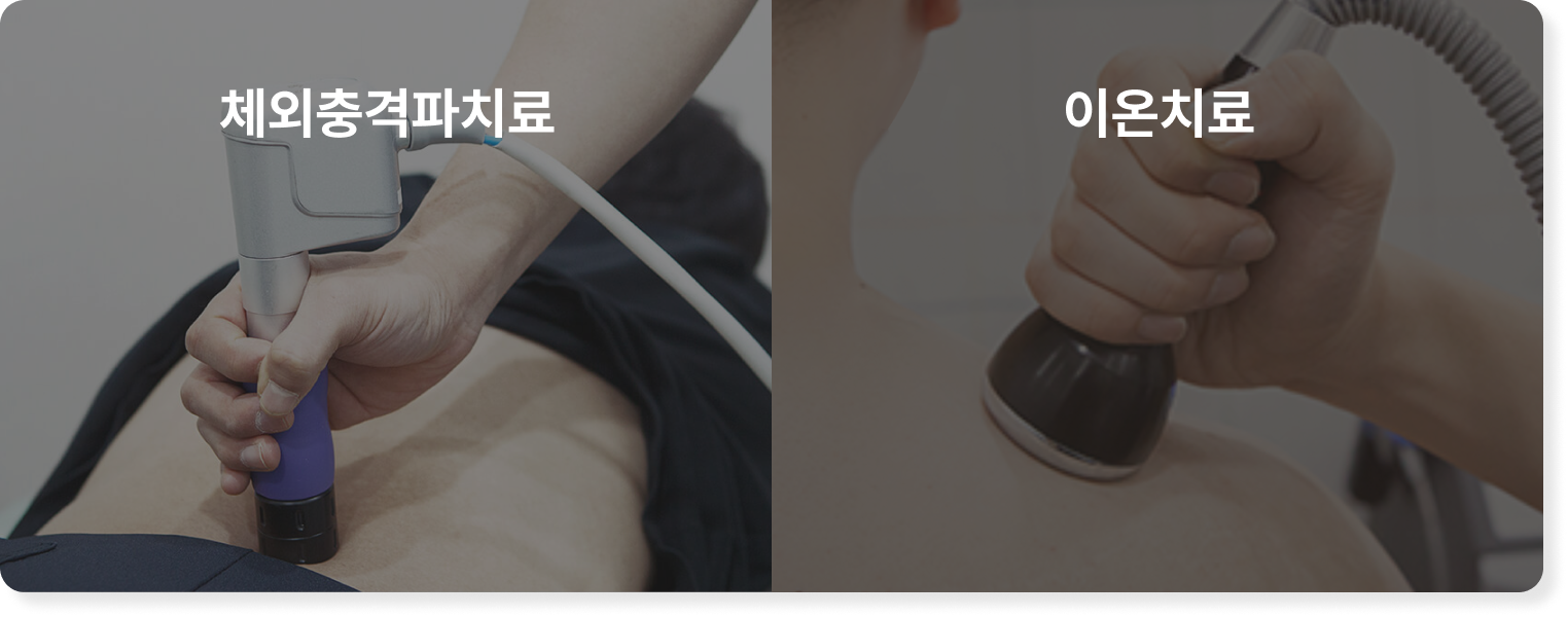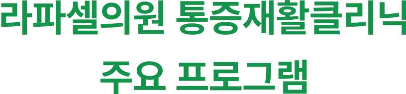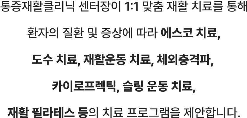 에스코 치료, 도수 치료, 재활운동 치료, 체외충격파 카이로프렉틱, 슬링 운동 치료, 재활 필라테스 등의 치료 프로그램을 제안합니다.